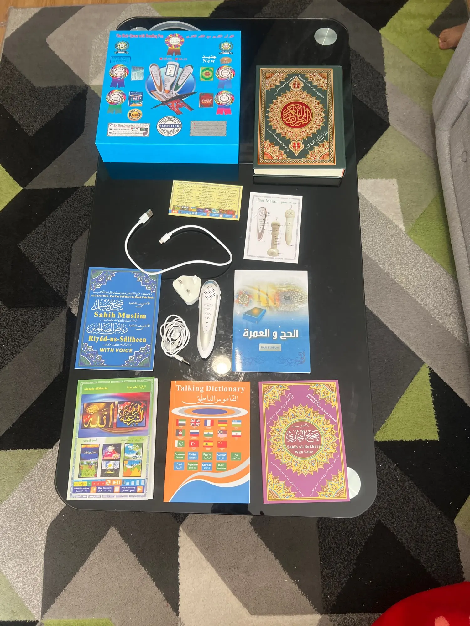 9.Includes Beautiful printed Holy Quran and 5 small books (hajj umrah, qaida noorania, multilingual dictionary, bukhari, Hismul ) arabic books with audio